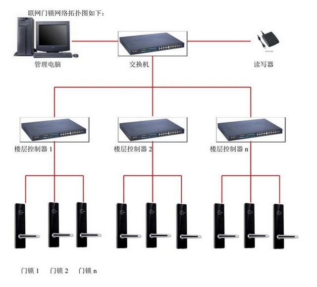 联网门锁系统主要包括:感应卡门锁、过线器、管理电脑、管理软件、读写器、交换机、楼层控制器、感应卡片、感应卡专用节电开关等。